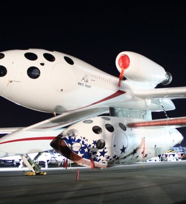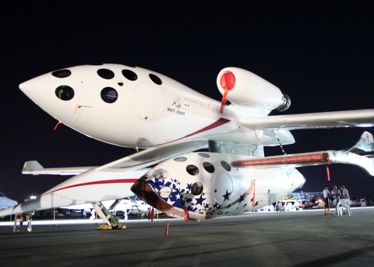 Spaceship one under the White Knight at Airventure after a successful sub-orbital flight.